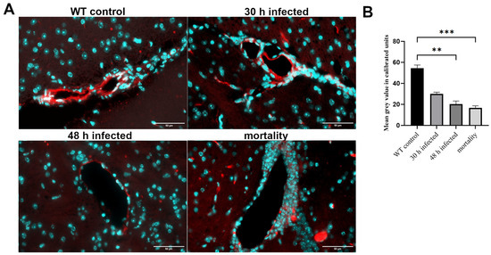 Lastly, claudin-5, an essential protein for tight junction formation in the BBB, was examined [29]. As shown in Figure 3A, the highest immunofluorescence signal was detected in the capillary walls of the control group, with the signal decreasing over the course of infection. This was confirmed by quantifying the fluorescence intensity. The reduction in claudin-5 fluorescence intensity at 48 h post-infection and in the mortality group was significant (Figure 3B; ** p < 0.01, *** p < 0.001; one-way ANOVA followed by Bonferroni test). As in Supplemental Table S1, we have summarized the results of Figure 1, Figure 2 and Figure 3, including any significant differences that were highlighted.