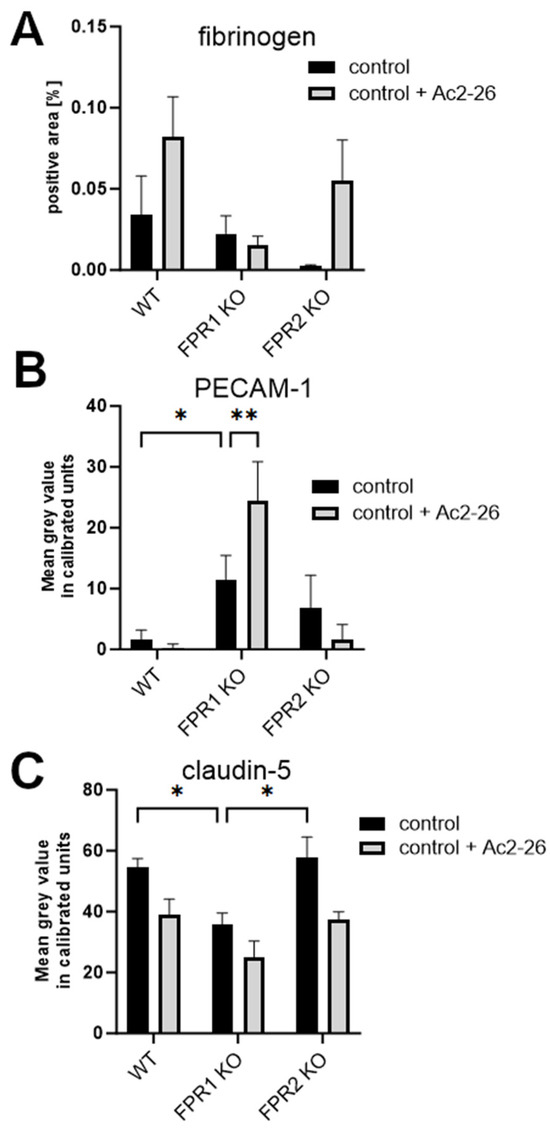Lastly, we analyzed claudin-5 fluorescence intensity in treated WT, FPR1-KO, and FPR2-KO control mice with or without Ac2-26 treatment. As shown in Figure 4C, FPR1-KO control mice displayed a significant reduction in claudin-5 fluorescence intensity compared to WT or FPR2-KO controls (* p < 0.05; two-way ANOVA followed by Bonferroni test). The reduction in fluorescence intensity in all three genotypes by Ac2-26 was not significant.