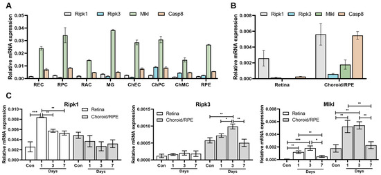 Ripk1, Ripk3, Mlkl, and Caspase 8 expression in retinal and RPE/choroid cells and tissues. (A) The expression of Ripk1, Ripk3, Mlkl, and Caspase 8 in various cell types, prepared from WT mouse retina and choroid in our laboratory, was determined by qPCR as described in the Materials and Methods. Please note the limited expression of Ripk3 in retinal EC (REC), RPC, and RAC. (B) The expression of Ripk1, Ripk3, Mlkl, and Caspase 8 in retina and choroid/RPE tissues prepared from 8-week-old WT mice. Please note that Ripk1 had a higher level of expression than Ripk3 or Mlkl. Please also note that choroid/RPE had significantly higher levels of Ripk1, Ripk3, Mlkl, and Casp8 than the retina. (C) The expression of Ripk1, Ripk3, and Mlkl in retina and choroid/RPE tissue prepared from WT mice treated with NaIO3. C57BL/6j male and female mice (8-week-old) received a single 50 mg/kg IP of NaIO3, and retina and choroid/RPE were harvested 1, 3, and 7 days later. The expressions of Ripk1, Ripk3, and Mlkl were then assessed by qPCR analysis as described in the Methods section. *** p < 0.001, ** p < 0.01, * p < 0.05; ANOVA, n = 8.