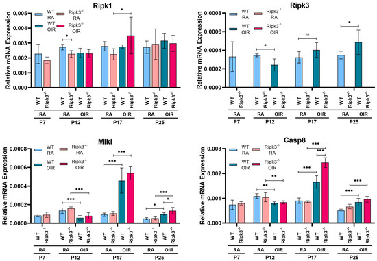 Expressions of Ripk1, Ripk3, Mlkl, and Casp8 during OIR. WT and Ripk3−/− mice were subjected to OIR or maintained in room air, as detailed in the Methods section. RNA was prepared at the indicated time point, and expressions of Ripk1, Ripk3, Mlkl, and Casp 8 were determined by qPCR. (*** p < 0.001, ** p < 0.01, * p < 0.05; n = 6). ns = not significant.