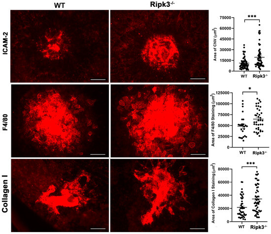 Increased ICAM-2, F4/80, and collagen I staining following laser photocoagulation in Ripk3−/− mice. Male and female mice (3-month-old) underwent the laser photocoagulation-induced rupture of Bruch’s membrane. At the noted intervals following laser photocoagulation, the eyes were sectioned at the equator and the anterior half, with the vitreous and retina discarded. The remaining RPE/choroid complex was stained with anti-ICAM-2 (vascular marker at 2 weeks), anti-F4/80 (macrophage marker at 3 days), or anti-collagen I (fibrosis marker at 5 weeks). Images were taken from a Zeiss microscope (Zeiss, Chester, VA, USA) used in digital format. The total area (in µm2) was measured using ImageJ software (right panel). Each dot is one laser spot. Scale bar = 50 µm. All experiments were repeated with at least 8 mice. (* p < 0.05, *** p < 0.001; Student’s unpaired t-test (2-tailed).