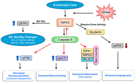 - Gao, S.; Griffin, C.T. Ripk3 modulates growth factor receptor expression in endothelial cells to support angiogenesis. Angiogenesis 2021, 24, 519–531. [Google Scholar] [CrossRef]