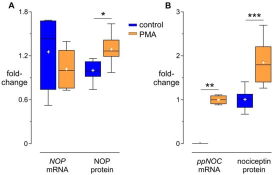 Effects of PMA on NOP (A) and nociceptin (B) mRNA and protein levels in THP-1 cells. Cells were treated with PMA 5 ng/mL or without PMA (controls) for 24 h. Median with interquartile range and 10–90 percentiles; mean “+”; mRNA and protein data are representative of six and twelve independent experiments, respectively. Wilcoxon tests * p < 0.05; ** p < 0.005; *** p < 0.001, compared to the respective controls.