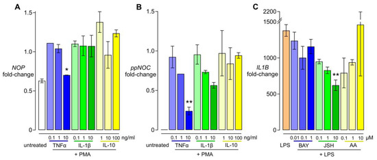 Concentration ranges of 0.1 to 10 ng/mL for TNF-α and IL-1β and 1 to 100 ng/mL for IL-10 were used. Results showed that TNF-α combined with PMA suppressed NOP and ppNOC mRNA expression in a dose-dependent manner. IL-1β dose-dependently prevented the upregulating effect of PMA on ppNOC mRNA after 24 h. No obvious dose–response effects of IL-10 on ppNOC and NOP mRNA levels were observed (Figure 2A,B). Based on these results, TNF-α 10 ng/mL and IL-1β 10 ng/mL were used in further experiments. In addition, cells were pretreated without/with various concentrations of NFκB inhibitors BAY 11-7082 (BAY), JSH-23 (JSH), or anacardic acid (AA) for 1 h, followed by exposure to LPS 100 ng/mL for 6 h. qPCR analysis indicated BAY, JSH, and AA affected the LPS-induced IL1B mRNA expression in a dose-dependent manner (Figure 2C). Based on this pilot testing, NFκB inhibitors were used at 100 nM in the subsequent experiments.
