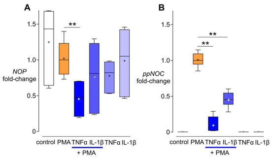 Effects of TNF-α and IL-1β on NOP and ppNOC mRNA expression. THP-1 cells were cultured without/with PMA 5 ng/mL in the presence or absence of TNF-α 10 ng/mL or IL-1β 10 ng/mL for 24 h. Quantitative PCR analysis of NOP (A) and ppNOC mRNA expression (B). Fold change values in mRNA levels are normalized against the respective PMA groups. Data are from six independent experiments and are presented as median with interquartile range and 10–90 percentiles; mean “+”. Wilcoxon test with post hoc test. ** p < 0.005.