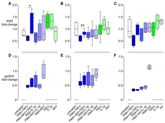 Effects of NFκB inhibitors on NOP and ppNOC mRNA expression. THP-1 cells were stimulated without/with PMA 5 ng/mL for 24 h, followed by treatment without/with one of the NFκB inhibitors (BAY 11-7082 (BAY, 100 nM), JSH-23 (JSH, 100 nM), and anacardic acid (AA, 100 nM)) for 1 h before exposure to TNF-α 10 ng/mL or IL-1β 10 ng/mL for 6 h (BAY and JSH) and for 12 h (AA). NOP (A–C) and ppNOC mRNA levels (D–F) are fold-change related to the corresponding PMA groups (controls). Median with interquartile range and 10–90 percentiles, experiment using BAY or AA, n = 4; experiment using JSH, n = 7. Mann–Whitney U test with post hoc test. * p < 0.05; ** p < 0.005.