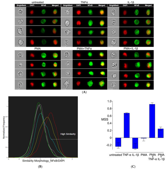 NFκB/p65 and nuclear signals were acquired using ImageStream, and the similarity score was calculated for NFκB/p65 nuclear localization (Figure 5A–C). Image analysis revealed that TNF-α 10 ng/mL increased the intensity of Alexa 594-labeled anti-NFκB/p65 (green) and strongly induced NFκB/p65 nuclear translocation in THP-1 cells after one hour compared to untreated controls. Weak activation of NFκB/p65 was observed in cells treated with IL-1β 10 ng/mL; no NFκB/p65 nuclear translocation was detected. THP-1 cells stimulated with PMA 5 ng/mL for 24 h, NFκB/p65 signal was increased compared to the untreated control. However, phosphorylated NFκB was cytosolic and accumulated around the nucleus in PMA-treated cells. Strong translocation of cytoplasmic NFκB/p65 to the nuclei was visible through imaging as green spots inside the nuclei after PMA-induced THP-1 cell exposure to TNF-α for one hour, whereas only a weak NFκB/p65 nuclear localization was observed in the PMA + IL-1β samples.