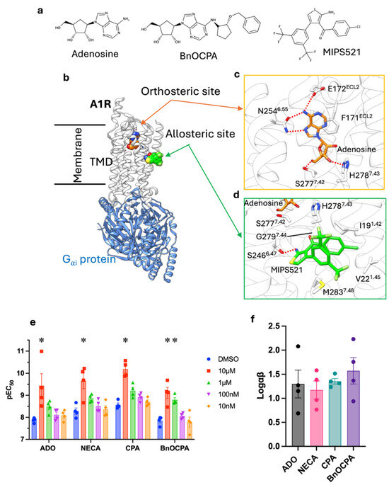 (a) Structure of the A1R ligand simulated in this study: the agonists adenosine and BnOCPA and the positive allosteric modulator MIPS521; (b) membrane view of the orthosteric and allosteric binding site of the A1R (white ribbon) bound to the Gαi protein (blue ribbon); (c,d) detailed binding mode of adenosine (orange) and MIPS521 (green) within their respective binding sites; (e) cAMP assay pEC50 of the A1R agonists CPA, BnOCPA, adenosine (ADO) and NECA at increasing concentrations of MIPS521 (10 nM, orange; 100 nM, purple; 1 μM, green, *: p = 0.0042 for BnOCPA; 10 μM, red, *: p < 0.0001 for all the agonists tested). (f) MIPS allosteric operator Logαβ measured for CPA (cyan), BnOCPA (purple), ADO (grey), and NECA (pink).