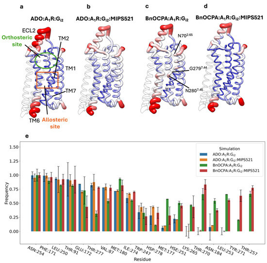 (a–d) A1R Cα root mean square fluctuations (RMSFs) plotted on the receptor backbone, colour-coded, and with ribbon thickness proportional to the RMSF value for (a) ADO:A1R:Gi2, (b) ADO:A1R:Gi2:MIPS521, (c) BnOCPA:A1R:Gi2, (d) BnOCPA:A1R:Gi2:MIPS521; the orange rectangle in (a) indicates the MIPS521 binding site position. (e) Contacts between the A1R and adenosine or BnOCPA in a ternary or quaternary complex with Gi2 and MIPS521.