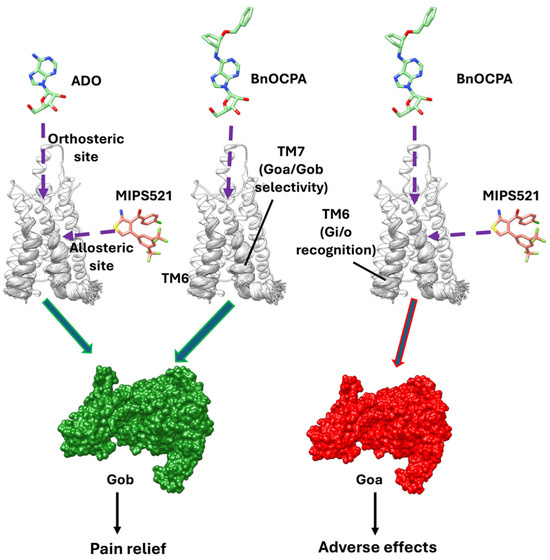 Allosteric modulation is the regulation of a protein’s activity through the binding of an effector molecule at a specific site on the protein, known as the allosteric site, which is distinct from the orthosteric (main) one [10]. This ternary interaction alters the protein’s conformation, thereby modulating its function. Allosteric modulators can either enhance (positive allosteric modulators—PAMs) or inhibit (negative allosteric modulators—NAMs) the activity of the protein. BnOCPA and MIPS521 have divergent action mechanisms but overlapping analgesic effects in vivo. BnOCPA’s direct action is orthosterically exerted through the preferential activation by the A1R of the subtype Gob among the six Gαi/o proteins; the PAM MIPS521 enhances the effect of the endogenous agonist adenosine from a membrane-exposed allosteric binding site (Figure 1b).