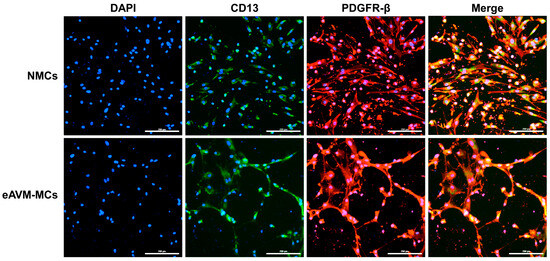 Characterization of mural cell-specific expression of CD13 (green) and PDGFR-β (red) in NMCs (top row) and eAVM-MCs (bottom row) using immunofluorescence in samples isolated from the same patient. Magnification = 20×; bar = 200 μm.