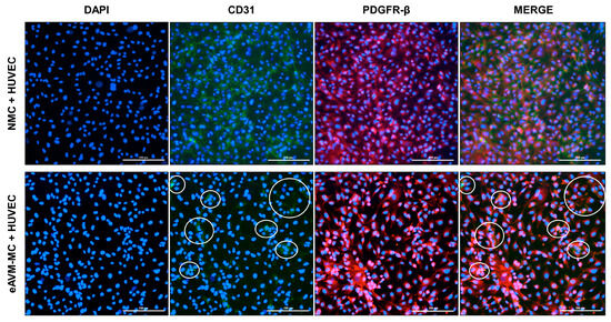Loss of CD31 (green) expression in HUVECs co-cultured with eAVM-MCs (PDGFR-β red). Representative image shows that CD31 expression was not affected in HUVECs when co-cultured with MCs isolated from normal tissue (NMCs, top row), whereas CD31 expression was reduced in HUVECs when co-cultured with eAVM-MCs (bottom row). White circles highlight regions of CD31 expression. Magnification = 20×; bar = 200 μm.