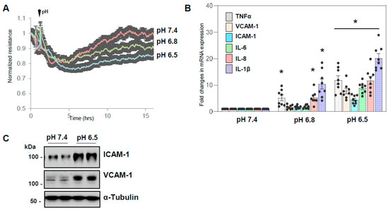 Acidosis induces endothelial dysfunction. (A) TEER measurements in HPAEC monolayers incubated at normal pH 7.4 (red) or lowered pH levels: pH 6.8 (green) and pH 6.5 (blue). Time point of pH change is marked by arrow. TEER changes were monitored over time; n = 4. (B) qRT-PCR analysis of mRNA expression of inflammatory marker genes: TNF-α, VCAM-1, ICAM-1, IL-6, IL-8, and IL-1β in HPAECs cultured in media with normal and acidic pH for 3 h. The histograms represent single points, mean (bar), and SD values; * p < 0.05, vs. pH 7.4; n = 6–8. (C) Western blot analysis of ICAM-1 and VCAM-1 protein expression by HPAECs incubated for 6 h under control (pH 7.4) or acidic (pH 6.5) conditions; probing for α-tubulin was used as a loading control. Shown are representative data of 5 independent experiments.