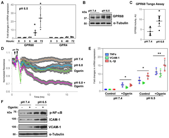 Ischemic and inflammatory conditions stimulate lactate production via anaerobic glycolysis that leads to extracellular acidification [1]. The co-existence of tissue acidification and inflammation during various pathological conditions suggests that extracellular pH may be an active and direct modulator of immune function [2]. Besides proton-sensing ion channels, a family of G protein-coupled receptors (GCPRs) comprising GPR4, GPR65, or T-cell death-associated gene 8 (TDAG8), GPR68, or ovarian cancer GPCR1 (OGR1), and GPR132 also function as proton sensors [3,4]. Among these GPCRs, GPR4 and GPR68 show more widespread expression across various organs, including vascular endothelial cells (ECs). Indeed, a few studies have already demonstrated that acidosis-induced activation of GPR4 mediates increased endothelial permeability, inflammatory response, and endoplasmic reticulum stress in ECs [5,6,7,8]. A recent study has suggested the involvement of GPR68 expressed in microvascular ECs in controlling flow-mediated EC-dependent dilation of mesenteric arteries in mice [9]. However, a precise role of GPR68 in mediating acidosis or inflammatory agonist-induced endothelial dysfunction remains unknown.