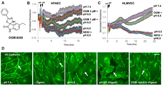 As our results suggested that GPR68 activation enhances acidosis-induced endothelial barrier disruption and inflammation, we next tested the hypothesis that GPR68 inhibition rescues acidic pH-derived endothelial dysfunction. For this purpose, we employed OGM-8345 (Figure 3A), a GPR68-specific small molecule inhibitor recently developed by our group [18,23]. OGM-8345 caused pronounced and dose-dependent attenuation of HPAEC permeability caused by acidic pH, while the GPR4 inhibitor NE52-QQ57 was without effect (Figure 3B). A strong protective effect of OGM-8345 against acidic pH-induced EC barrier disruption was also observed in lung microvascular EC (Figure 3C), while GPR4 inhibitor failed to prevent permeability increase. OGM-8345-mediated EC barrier protection was further evaluated by analysis of EC adherens junction integrity using immunostaining of adherens junction protein VE-cadherin. Ogerin or acidic pH alone disrupted the continuous pattern of VE-cadherin staining with the appearance of paracellular gaps (Figure 3D). Breakdown of EC junctions was further augmented when both stimuli were combined. Importantly, EC pre-treatment with OGM-8345 attenuated the disruption of EC junctions caused by acidic pH and Ogerin, reflected by the preservation of a continuous VE-cadherin staining pattern and prevention of paracellular gap formation (Figure 3D).
