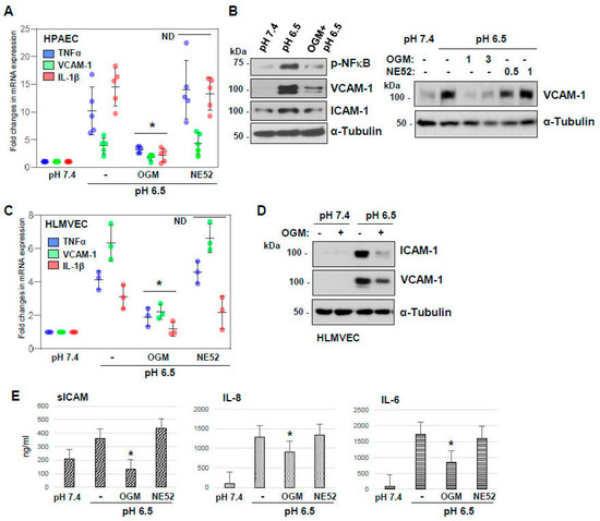 OGM-8345 but not NE52 attenuates acidosis-induced endothelial inflammatory responses. (A) HPAECs were switched to acidic pH medium alone or supplemented with indicated GPCRs inhibitors. After 3 h of incubation, mRNA expression analysis of TNF-α, VCAM-1, and IL-1β was performed by qRT-PCR. * p < 0.05, vs. pH 6.5, ND: statistically not significant compared to pH 6.5; n = 5. (B) HPAECs were incubated in acidic pH media with or without OGM-8345 (3 µM, 6 h); the levels of NFkB phosphorylation and VCAM-1 and ICAM-1 protein expression were determined by Western blot; α-tubulin was used as a loading control (left panel). VCAM-1 protein levels were determined in cells incubated at acidic pH with indicated doses (in µM) of OGM-8345 or NE52-QQ57 (right panel). (C,D) HLMVEC were incubated in acidic pH medium alone or with OGM-8345 or NE52-QQ57 where indicated. (C) After 3 h, mRNA levels of TNF-α, VCAM-1, ICAM-1, and IL-1β were determined by qRT-PCR * p < 0.05, vs. pH 6.5, ND: statistically not significant compared to pH 6.5; n = 3. (D) Western blot analysis of ICAM-1 and VCAM-1 protein expression; reprobing with α-tubulin served as a loading control. (E) HPAECs exposed to acidic pH media with or without indicated inhibitors for 6 h were subjected to ELISA analysis to determine the secretory levels of sICAM, IL-8, and IL-6; * p < 0.05, vs. pH 6.5, n = 3.