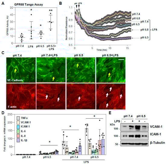 Because extracellular acidification is typically associated with the onset of inflammatory response to infection [24], we examined if these two factors act in synergy to cause endothelial dysfunction. GPR68 activation was measured by the PRESTO-Tango assay under normal (pH 7.4) and acidic (pH 6.5) pH levels with or without adding LPS. The results showed that LPS-induced GPR68 activation was further augmented by pH acidification (Figure 5A). The measurements of TER in HPAEC monolayers showed that LPS-induced barrier disruption was gradually augmented by changing the pH of culture medium from 7.4 to 6.8 and 6.5 (Figure 5B). LPS and acidic pH also acted synergistically in causing the breakdown of EC adherens junctions and paracellular gap formation, as visualized by VE-cadherin and F-actin immunofluorescence staining (Figure 5C). Similarly, lowering pH to 6.6 augmented the HPAEC inflammatory response to LPS, reflected by increased mRNA expression of TNF-α, VCAM-1, and ICAM-1 and protein expression of VCAM-1 and ICAM-1 (Figure 5D,E).