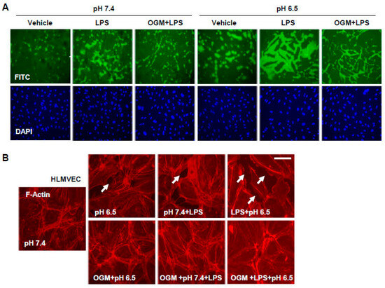 Alternative analysis of endothelial barrier dysfunction by the XPerT assay demonstrated the synergistic effect of LPS and culture medium acidification from pH 7.4 to pH 6.5 on the permeation of FITC-labeled tracer through the EC monolayer, reflecting a rise in macromolecular permeability (Figure 6A). This permeability increase was strongly attenuated by OGM-8345, illustrated by a sharp decrease in green fluorescence signal at intercellular areas (Figure 6A).