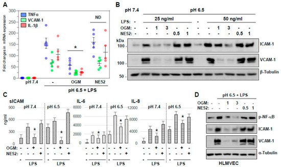 OGM-8345, but not NE52-QQ57, attenuates acidosis- and LPS-induced endothelial inflammation. (A) HPAECs pre-treated with OGM-8345 or NE52 (30 min) were switched to media with pH 6.5 followed by stimulation with LPS (50 ng/mL, 3 h). qRT-PCR analysis was carried out to determine mRNA transcript levels of TNF-α (blue), VCAM-1 (green), and IL-1β (red). * p < 0.05, vs. pH 6.5+LSP, ND—statistically not significant; n = 5. (B) HPAECs were pre-incubated with OGM-8345 (1 or 3 µM) or NE52-QQ57 (0.5 or 1 µM) at acidic pH followed by the addition of LPS (50 ng/mL, 6 h). Protein expression of ICAM-1 and VCAM-1 was determined by Western blot; β-tubulin was used as a loading control. (C) HPAECs pre-treated with OGM-8345 or NE52 (1 µM, 30 min) were incubated at normal or acidic pH followed by the addition of LPS (50 ng/mL, 6 h). Secretory protein levels of sICAM, IL-6, and IL-8 in conditioned media were evaluated by ELISA assay. * p < 0.05, vs. corresponding LPS groups, n = 3. (D) HLMVEC were pre-incubated with indicated doses (in µM) of GPR68 and GPR4 inhibitors at pH 6.5 media for 30 min followed by LPS stimulation (100 ng/mL, 6 h). Cell lysates were subjected to Western blot analysis to determine protein levels of phospho-NFkB, ICAM-1, and VCAM-1; reprobing for α-tubulin was used as a loading control. Shown are representative results of 4 independent experiments.