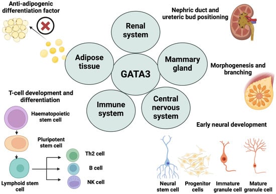Diverse roles of GATA3 in cell differentiation and systemic development. This diagram illustrates several roles of GATA3 across different cell types and biological systems. GATA3 influences various processes, including adipogenesis, where it acts as an anti-adipogenic factor by inhibiting adipocyte differentiation. In the renal system, GATA3 is crucial for the positioning of the nephric duct and ureteric bud. It also plays a key role in the immune system, regulating hematopoietic, pluripotent, and lymphoid stem cells through Wnt and Notch signaling, leading to the differentiation of NK cells, T lymphocytes (Th2), and B lymphocytes. In the mammary gland, GATA3 is involved in morphogenesis and branching, essential for tissue development. Additionally, GATA3 contributes to early neural development in the central nervous system, influencing the differentiation of neural stem cells, precursor cells, and mature glial cells. (Drawn by biorender).
