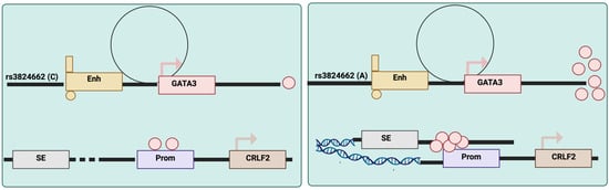 Recent research has identified noncoding genetic variations in GATA3 that increase the risk of acute lymphoblastic leukemia (ALL). For example, the rs3824662 variant acts as a cis-acting enhancer that accelerates GATA3 transcriptional activity, reshaping global chromatin accessibility and increasing susceptibility to chromosomal rearrangements [], leading to increased incidence at regulatory sites and de novo occupancy in certain elements. Such a shift in the overall chromatin state plays a role in the development and progression of Ph-like ALL []. This discovery provides insights into the genetic regulation of GATA3 and its role in leukemogenesis (Figure 4).