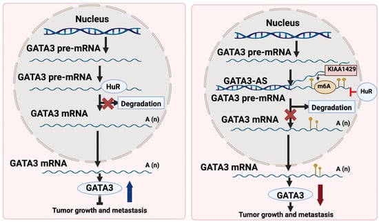GATA3 functions as the main activator for tumor suppressor genes via binding to their promoters. Nonetheless, the mechanisms behind GATA3 downregulation leading to switching off the tumor suppressor genes in most cancers remain elusive. One of the possible mechanisms of GATA3 depletion in hepatocellular carcinoma (HCC) is the post-transcriptional modification that disturbs its mRNA levels, thereby diminishing its protein levels []. In a previous study, GATA3 downregulation was attributed in HCC to the formation of GATA3-antisense (GATA3-AS) that antagonizes GATA3 and functions as a cis-regulatory element, thus directing m6A modification by KIAA1429 on the GATA3 pre-mRNA []. This post-transcriptional modification leads to the degradation of GATA3 mRNA, contributing to HCC progression []. On the contrary, GATA3-AS depletion was associated with suppressed malignant phenotypes in hepatoma cells that were rescued by GATA3 inhibition []. Understanding this novel mechanism of GATA3 downregulation in HCC opens new avenues for therapeutic interventions targeting GATA3-AS and m6A modification. GATA3 mediates the metastasis driven by KIAA1429 or GATA3-AS as shown in Figure 5.