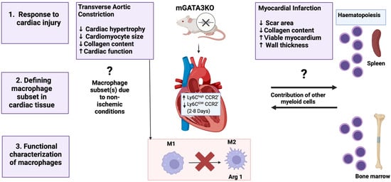 - Yang, M.; Song, L.; Wang, L.; Yukht, A.; Ruther, H.; Li, F.; Qin, M.; Ghiasi, H.; Sharifi, B.G.; Shah, P.K. Deficiency of GATA3-positive macrophages improves cardiac function following myocardial infarction or pressure overload hypertrophy. J. Am. Coll. Cardiol. 2018, 72, 885–904. [Google Scholar] [CrossRef]
