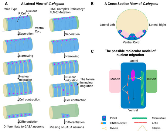 Nuclear migration in P cells of C. elegans. (A) From a lateral view of C. elegans, first, P-cells separate from each other; second, P cells narrow; third, the nuclei of P cells migrate from the lateral to the ventral cord; fourth, the cytoplasm of P cell retracts to the ventral cord; last, P cells develop into GABA neurons. LINC complex deficiency or FLN-2 mutant C results in the failure of nuclear migration and P cell differentiation. (B) From a cross-section view of C. elegans, the nuclear shape is altered through a constricted space between muscles and cuticle during migration. (C) One possible molecular model of nuclear migration. The nucleus migrates from the lateral to the ventral cord, relying on the deformability of the NE and the interaction between the LINC complex and the cytoskeleton. Created in https://BioRender.com.