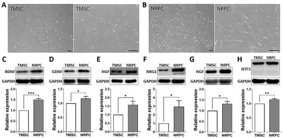 A comparison of TMSCs and NRPCs revealed that TMSCs had a spindle-like fibroblast shape (Figure 1A), whereas NRPCs exhibited morphological changes after differentiation, with thinner cytoplasmic extensions, larger nuclei, and an elongated bipolar or tripolar spindle shape (Figure 1B). These cells were harvested and analyzed for the expression of neurotrophic factors at the protein level, including the brain-derived neurotrophic factor (BDNF), glial cell-derived neurotrophic factor (GDNF), HGF, neuregulin 1 (NRG1), nerve growth factor (NGF), and neurotrophic factor-3 (NTF3), using WB. The expression of each of these proteins was significantly increased in the NRPC vs. the TMSC group (Figure 1C–H). GDNF is involved in the proliferation, differentiation, and survival of nerve cells (Figure 1D), whereas HGF creates new blood vessels and promotes the growth and regeneration of nerves (Figure 1E). It was confirmed that the expression of BDNF and HGF was upregulated by about 1.5-fold in NRPCs compared with TMSCs (Figure 1C,E). In turn, the expression of NRG1, which promotes neuronal and glial responses during neuronal regeneration, was increased by about 3-fold in NRPCs compared with TMSCs (Figure 1F).