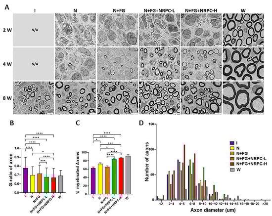 Observation of the myelination of the sciatic nerve of PNI rats using TEM. (A) Representative images of sciatic nerve cross-sections prepared at 2, 4, and 8 weeks after treatment (2 W, 4 W, and 8 W). The observation was not possible in the I group. Original magnification, 5000×. The axons in the only 8 W images were measured, followed by the quantification of the myelin thickness, indicating recovery of the sciatic nerve, based on the G-ratio (B) and the ratio of myelinated nerve fibers in the sciatic nerve (C). (D) Distribution of myelinated axons classified at 2 μm intervals between groups altered by NRPC application. Two-way ANOVA and Holm–Šídák’s multiple comparison test (row factor (number of axons per 2 μm diameter); column factor (group): (* p < 0.05; *** p < 0.001; and **** p < 0.0001)). PNI, peripheral nerve injury; TEM, transmission electron microscopy; NRPCs, neuronal regeneration-promoting cells; I, injury; N, neurorrhaphy; N + FG, neurorrhaphy + fibrin glue; N + FG + NRPC-L, neurorrhaphy + fibrin glue + NRPC-low; N + FG + NRPC-H, neurorrhaphy + fibrin glue + NRPC-high; W, wild type; and N/A, not applicable.