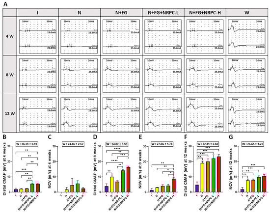 Confirmation of neural function recovery in PNI rats after NRPC application by NSC analysis. (A) Original graph of the NCS results at 4, 8, and 12 weeks (4 W, 8 W, and 12 W) after treatment. The distal CMAP and NCV values measured from the NCS results were quantified and compared between the groups at 4 W (B,C), 8 W (D,E), and 12 W (F,G), respectively. One-way ANOVA and Tukey’s post hoc test were performed for comparison between groups. The data are presented as the mean ± SEM (* p < 0.05; ** p < 0.01; *** p < 0.001; and **** p < 0.0001). PNI, peripheral nerve injury; NRPCs, neuronal regeneration-promoting cells; I, injury; N, neurorrhaphy; N + FG, neurorrhaphy + fibrin glue; N + FG + NRPC-L, neurorrhaphy + fibrin glue + NRPC-low; N + FG + NRPC-H, neurorrhaphy + fibrin glue + NRPC-high; W, wild type; NCS, nerve conduction study; CMAP, compound muscle action potential; and NCV, nerve conduction velocity.