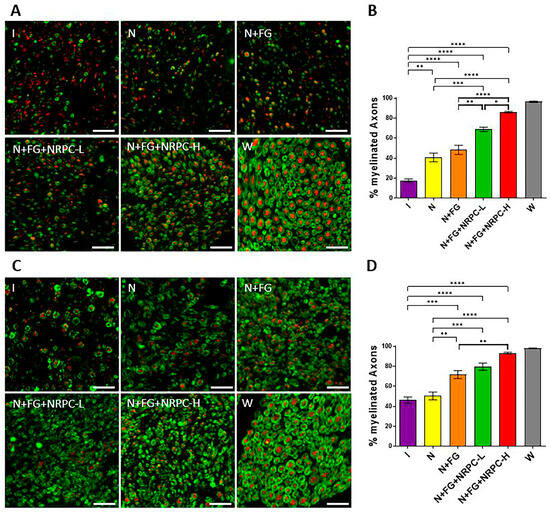 Axon regeneration and myelin formation in sciatic nerves in PNI rats treated with NRPCs. IHC staining for MBP (green) and NF-H (red) was performed at 6 (A) and 12 (C) weeks after NRPC application. The scale bars indicate 50 μm. Graph quantifying myelination of axons using IHC images at 6 (B) and 12 (D) weeks after NRPC application. One-way ANOVA and Tukey’s post hoc test were performed for comparison between groups. The data are presented as the mean ± SEM of three independent experiments (* p < 0.05; ** p < 0.01; *** p < 0.001; and **** p < 0.0001). PNI, peripheral nerve injury; NRPCs, neuronal regeneration-promoting cells; I, injury; N, neurorrhaphy; N + FG, neurorrhaphy + fibrin glue; N + FG + NRPC-L, neurorrhaphy + fibrin glue + NRPC-low; N + FG + NRPC-H, neurorrhaphy + fibrin glue + NRPC-high; W, wild type; IHC, immunohistochemistry; MBP, myelin basic protein; and NF-H, neurofilament heavy.