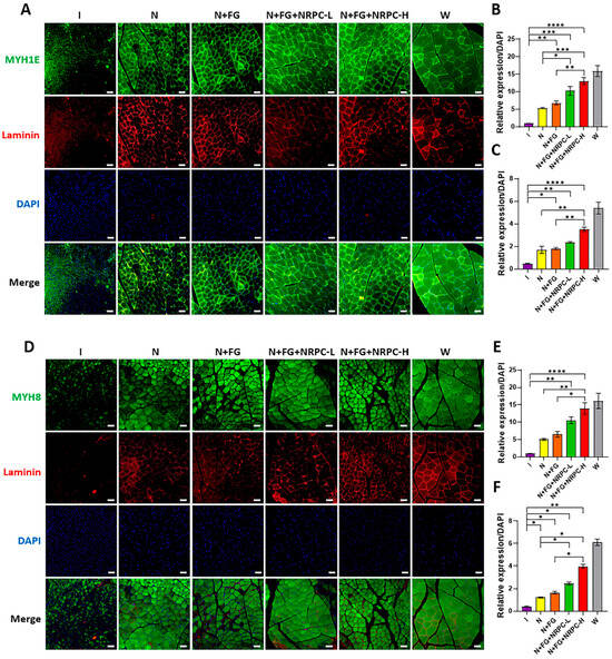 Confirmation of gastrocnemius regeneration in PNI rats at 12 weeks after NRPC application. Immunohistochemistry tissue staining for skeletal muscle-related makers, such as MYH1E (green), MYH8 (green), and laminin (red). The cross-sectioned slides of the muscles were double-stained with MYH1E and laminin (A) or MYH8 and laminin (D), and those images were photographed and merged. All cells were counterstained with DAPI (blue). The scale bars indicate 100 μm. The expression levels of MYH1E and laminin (B,C) or MYH8 and laminin (E,F) were compared by quantification with DAPI using Image J software (Version 1.49). One-way ANOVA and Tukey’s post hoc test were performed for comparison between groups. The data are presented as the mean ± SEM of three independent experiments (* p < 0.05; ** p < 0.01; *** p < 0.001; and **** p < 0.0001). PNI, peripheral nerve injury; NRPCs, neuronal regeneration-promoting cells; I, injury; N, neurorrhaphy; N + FG, neurorrhaphy + fibrin glue; N + FG + NRPC-L, neurorrhaphy + fibrin glue + NRPC-low; N + FG + NRPC-H, neurorrhaphy + fibrin glue + NRPC-high; W, wild type; MYH1E, myosin heavy chain 1 E; MYH8, myosin heavy chain 8; and DAPI, 4′,6-diamidino-2-phenylindole dihydrochloride.