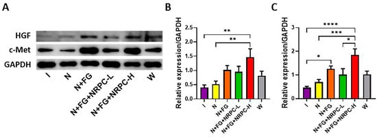Expression of HGF and c-Met in PNI rat models by NRPC application. (A) Expression of HGF and c-Met in PNI rat nerves, as assessed by WB. The expression of HGF (B) and c-Met (C) was quantified using Image J software (Version 1.49), and its level was normalized to that of GAPDH. One-way ANOVA and Tukey’s post hoc test were performed for comparison between groups. The data are presented as the mean ± SEM (* p < 0.05; ** p < 0.01; *** p < 0.001; and **** p < 0.0001). HGF, hepatocyte growth factor; c-Met, cellular mesenchymal–epithelial transition factor; PNI, peripheral nerve injury; NRPCs, neuronal regeneration-promoting cells; WB, Western blotting; TMSCs, tonsil-derived mesenchymal stem cells; I, injury; N, neurorrhaphy; N + FG, neurorrhaphy + fibrin glue; N + FG + NRPC-L, neurorrhaphy + fibrin glue + NRPC-low; N + FG + NRPC-H, neurorrhaphy + fibrin glue + NRPC-high; and W, wild type.