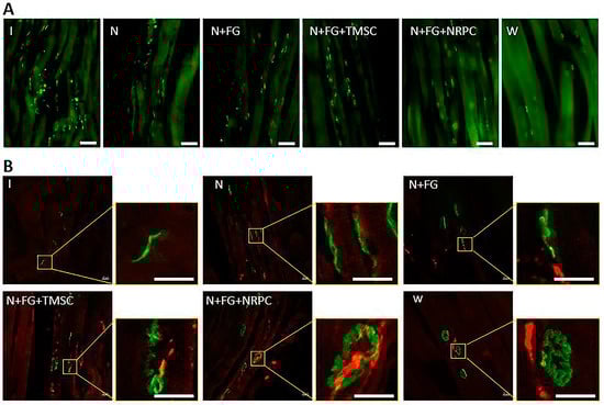Furthermore, the endplates in the N + FG + NRPC groups exhibited a relatively normal pretzel-like structure, whereas only very few or no pretzel-like endplates were detected in the I, N, and N + FG groups. The NMJ morphology of the N + FG + TMSC group was more regenerated than that of the I, N, and N + FG groups, but was less regenerated than that of the N + FG + NRPC groups (Figure 8B).