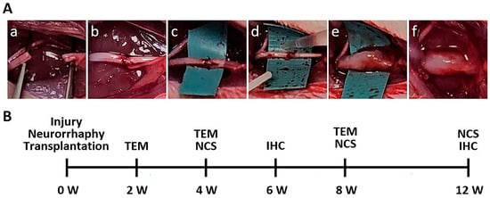 The protocols used with the rats were approved by the institutional animal care and use committee of Ewha Womans University College of Medicine, and all experiments were performed in accordance with the approved guidelines and regulations (IACUC No. EUM20-049). The rats were housed in cages and maintained on a 12 h light–dark cycle with free access to food and water. Nerve transection surgery was performed on 7-week-old male Sprague–Dawley rats weighing 150–200 g under isoflurane inhalation anesthesia. To produce the PNI model rats, the sciatic nerves were cut with sharp microsurgical scissors. Neurorrhaphy was immediately performed on the transect nerve with two-needle sutures, and then the mixture of NRPCs in 100 μL CS10 and/or 200 μL fibrin glue (Baxter, Deerfield, IL, USA) was transplanted with background material (Keisei Medical Industrial, Japan), for which the detailed process is described in Scheme 1. Also, normal rats without nerve transection were used as a control group; the cell numbers for application and the experimental groups are described in Table 1. In addition, background materials were used for the injection of the mixture into the sciatic nerve, and the detailed process is described in Scheme 1A. Following the neurorrhaphy procedure, the sciatic nerve was sutured with 8–0 nylon suture and the skin was sutured with 3–0 silk suture (Ethilon, Ethicon, Somerville, NJ, USA).