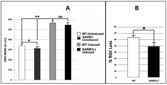 - Finnegan, L.K.; Chadderton, N.; Kenna, P.F.; Palfi, A.; Carty, M.; Bowie, A.G.; Millington-Ward, S.; Farrar, G.J. SARM1 Ablation Is Protective and Preserves Spatial Vision in an In Vivo Mouse Model of Retinal Ganglion Cell Degeneration. Int. J. Mol. Sci. 2022, 23, 1606. [Google Scholar] [CrossRef]