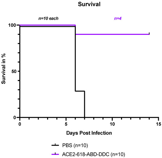 All infected k18-hACE2 mice that received PBS either died or had to be humanely euthanized by day seven post-viral inoculation as per the study protocol (Figure 1, black). In contrast, the survival of the mice that received ACE2 618-DDC-ABD was 90% on day six post-viral inoculation. Only one mouse in this group had to be humanely euthanized on day six post-viral inoculation (Figure 1, purple). To compare viral titers at similar time points, five healthy mice from the ACE2-618-DDC-ABD-treated group were sacrificed on day six post-viral inoculation. The remaining four mice in this group all survived until day 14, the end of the study period. This marked difference in survival was statistically significant (p = 0.0004 using log-rank (Mantel–Cox) test).