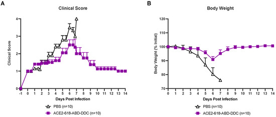 Clinical score and body weight of k18-hACE2 mice infected with the SARS-CoV-2 Delta variant that received either ACE2 618-DDC-ABD or PBS. (Panel (A)) Infected animals in the PBS control group (white) developed severe disease, and their clinical scores increased accordingly until days six and seven post-viral inoculation by which time point, all mice had either died or had to be humanely euthanized. In contrast, animals in the ACE2 618-DDC-ABD-treated group (purple) developed less severe disease, and their clinical scores were lower compared to the PBS control group. All remaining animals from the ACE2 618-DDC-ABD-treated group had recovered by the end of the 14-day study period. (Panel (B)) Infected animals in the PBS control group (white) lost up to ~20% of their initial body weight until days six and seven post-viral inoculation by which time point, all mice had either died or had to be humanely euthanized. In contrast, animals in the ACE2 618-DDC-ABD-treated group (purple) lost, on average, less than ~10% of their initial body weight by days six and seven post-viral inoculation. All remaining animals from the ACE2 618-DDC-ABD-treated group recovered stable body weight by the end of the 14-day study period.