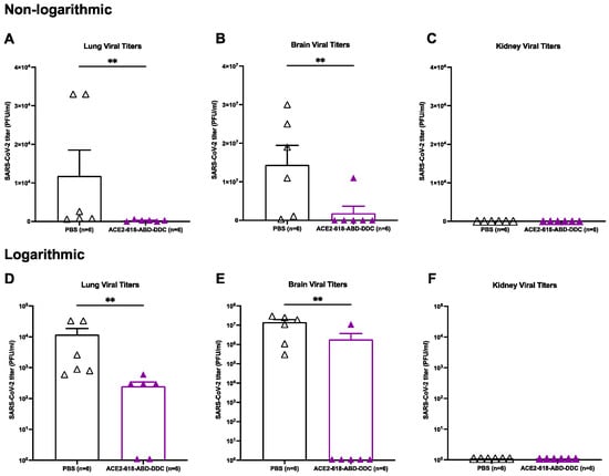 Kidney viral titers were assessed in all ten mice that received ACE2 618-DDC-ABD and in nine mice that received PBS. No kidney viral titers could be detected in either the PBS control or the ACE2 618-DDC-ABD-treated group (Figure 3C,F). The limit of detection for the plaque assay is 102 PFU/mL.