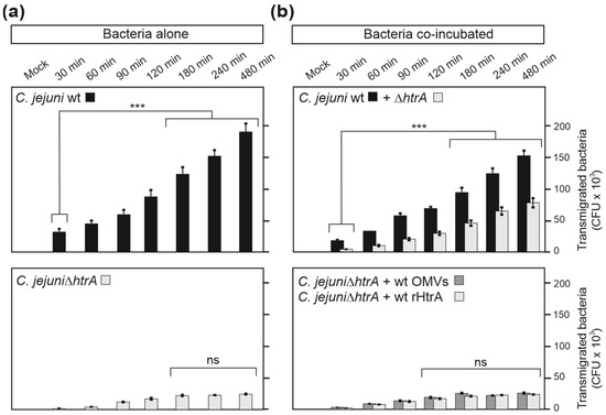 - Sharafutdinov, I.; Tegtmeyer, N.; Musken, M.; Backert, S. Campylobacter jejuni Serine Protease HtrA Induces Paracellular Transmigration of Microbiota across Polarized Intestinal Epithelial Cells. Biomolecules 2022, 12, 521. [Google Scholar] [CrossRef] [PubMed]