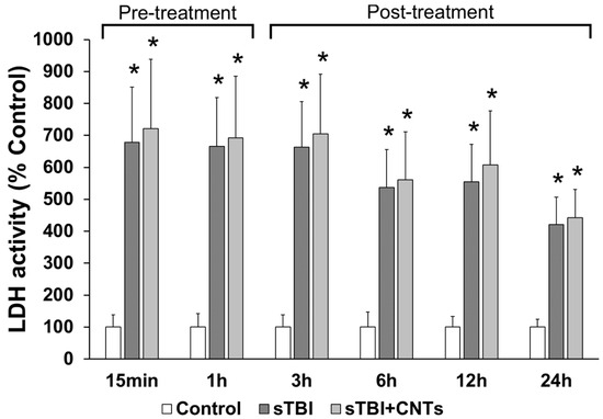 The lack of effect of chemically functionalized single-walled carbon nanotubes (CNTs) on the survival of the mouse primary astrocytes exposed to severe traumatic brain injury (sTBI) in vitro. Injured cells were treated with PEG (sTBI) or SWCNT-PEG (sTBI+CNTs) at 1 h post-stretch injury. Cell culture media were collected at different time points post-injury (15 min, 1 h, 3 h, 6 h, 12 h, and 24 h), from which lactate dehydrogenase (LDH) activity was quantified. Results are expressed as means ± SEM (N = 3). * p < 0.05, significantly different from the control (uninjured and PEG-treated) group (one-way ANOVA). There was not a significant change in LDH activity over time in the control group.