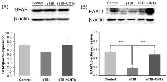 In the previous work in vitro using SWCNT-PEG at the same concertation as used here [18,19,23], SWCNT-PEG, when applied for a prolonged time (3 or 4 days vs. 24 h here), caused an increase in GFAP and EAAT1 levels in uninjured (vs both uninjured and injured here) astrocytes grown on polyethylene-imine-coated glass strata (vs silastic membranes here). The fact that, in the present work, we did not see changes in GFAP and/or EAAT1 expression, thus, could be attributed to any individual or combined experimental differences.