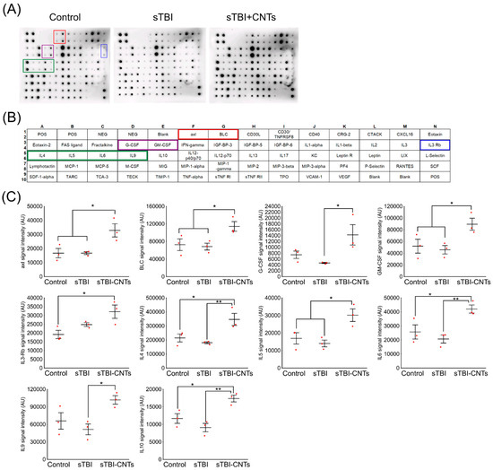 Chemically functionalized single-walled carbon nanotubes (CNTs) increase the secretion of selected cytokines from astrocytes exposed to severe traumatic brain injury (sTBI) in vitro. (A) Representative membranes showing the content/pattern of cytokines, released from the control group of astrocytes, i.e., uninjured and PEG-treated cells (control), astrocytes subjected to stretch injury and treated with PEG (sTBI) or treated with SWCNT-PEG (sTBI+CNTs). (B) Table with the list of cytokines available within the Mouse Cytokine Array C3 kit. Letters (A–N) and numbers (1–10) indicate coordinates (x,y) on the dot blot. Colored boxes indicate selected proteins with significant changes in their expression. (C) Summary graphs showing significant increases in signal intensity of selected (boxed in (A,B)) cytokines in the cell culture media samples from the SWCNT-PEG-treated injured astrocytes. Data are expressed as mean ± SEM. * p < 0.05, ** p < 0.001.