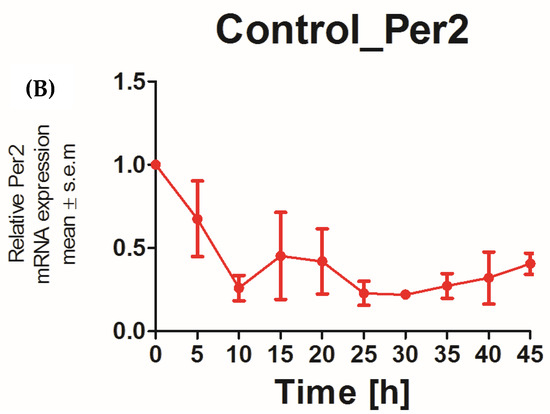 The applicability of N/TERT-1 keratinocytes for studies on the circadian rhythm was assessed by examining the circadian rhythm of the core clock genes PER2 and BMAL1. It was previously reported that the expression of BMAL1 peaked at 5–10 h and PER2 peaked at 25 h post synchronization with dexamethasone in HEKs [25]. In keeping with this finding, N/TERT-1 keratinocytes in our study exhibit a similar and successive pattern in the expression of BMAL1 and PER2 (Figure 1A,B). The peak expression of PER2 mRNA was observed at 15–20 h post synchronization. BMAL1 was the first core clock gene to peak 10 h post synchronization. The time between two successive peaks in BMAL1 expression was 25 h, which approximately corresponds to a circadian rhythm. These results also indicated that dexamethasone, a glucocorticoid, is a potent synchronizer of N/TERT-1 keratinocytes, just as in fibroblasts [26].