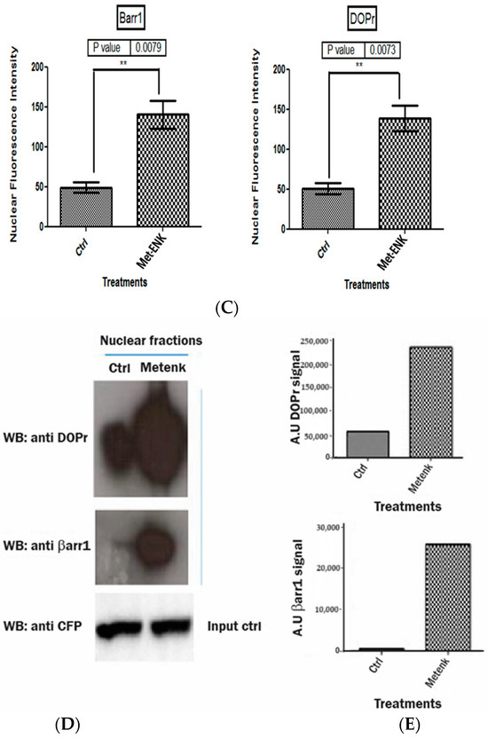 To test the hypothesis that βarr1 undergoes nuclear localization, we treated the cells with 100 nM Met-ENK for 5 min. We found that along with βarr1, even the DOPr undergoes nuclear localization (refer to Figure 4A,B). These results were further confirmed when the nuclear fractions of cells overexpressing CFP-tagged βarr1 and GFP-tagged DOPr were subjected to a CFP pulldown using an anti-CFP antibody. The pulldown lysate was then subjected to a Western blot analysis and tested for the presence of DOPr. The blot was then quantified to measure the increase in the amount of DOPr and βarr1 present in the nucleus as a result of Met-ENK treatment (Figure 4C).