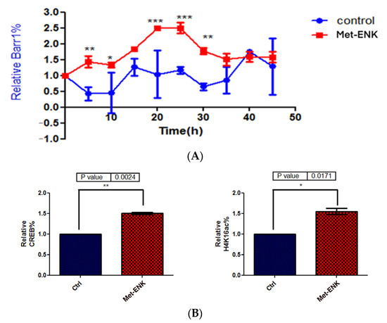 3.5. Met-Enkephalin Treatment Enhances and Induces a Phase Shift in Rhythmical βarr1 Binding on the PER2 Promoter and Enhances βarr1 Binding to Acetylated H4 in the PER2 Promoter