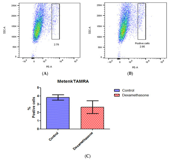 Met-enkephalin conjugated to the fluorophore TAMRA (Metenk-TAMRA) was used to detect the expression of DOPr on N/TERT-1 keratinocytes. Cells were seeded in triplicates in 6-well plates and grown to 70% confluence in K-SFM supplemented with BPE, EGF and 0.4 mM Ca2+ media. On the day of the experiments, BPE- and EGF-free K-SFM was used. Cells were either treated with 1 μM dexamethasone for 1 h or left untreated. Thereafter, both groups were trypsinized, washed and resuspended in 500 μL of 1X PBS (Ca2+, Mg2+-free). The cells were then incubated on ice with 100 nM Metenk-TAMRA or left untreated for the unstained control for 20 min, followed by sorting in the BD FACS CantoTM II. The observed cell populations were gated to isolate TAMRA-positive cells. Analysis was carried out by gating the live cell population in unstained/untreated cells. Further gating based on this selected population helped quantify Metenk-TAMRA positive cells in the dexamethasone-treated and -untreated cells. This analysis was carried out using the FlowJoTM v10.4 software. Obtained population numbers were recorded and then plotted using GraphPad Prism5 (GraphPad Software Inc., San Diego, CA, USA).