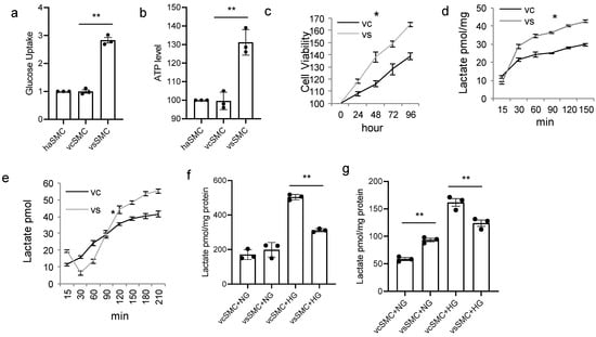 Contractile vSMCs and synthetic vSMCs respond to high glucose concentration differently. (a) Glucose uptake in smooth muscle cells (SMCs). Contractile vSMCs (vcSMCs), synthetic vSMCs (vsSMCs), and human arterial SMCs (haSMCs) (Fisher Scientific, USA) were cultured in basic DMEM with 25 mM glucose for 20 min; then, intracellular glucose concentrations were determined (Abcam, Cambridge, MA, USA) and normalized to measurements in haSMC. (b) ATP production in SMCs. haSMCs and vSMCs were cultured in 25 mM glucose; then, intracellular ATP levels were measured at 24 h, normalized to the level of haSMCs, and presented as a percentage. (c) Cell viability of SMC. Contractile vSMCs and synthetic vSMCs show different viability in high-glucose medium. (d,e) Dynamic change in lactate in glucose culture. The vSMCs derived from hiPSCs were cultured in (d) 5.5 mM (normal glucose, 1 g/L, NG) and (e) 25 mM glucose (high glucose, 4.5 g/L, HG). Lactate was measured at indicated time points with lactate assay kit (Biovision, Milpitas, CA, USA). Contractile vSMCs and synthetic vSMCs produce lactate differently depending on glucose concentration. (f,g) Comparison of lactate production in medium of contractile vSMC and synthetic vSMC culture (f) and in cell lysate of contractile vSMCs and synthetic vSMCs cultured in NG and HG (g). vSMCs produce more lactate in high-glucose culture. Contractile vSMCs release more lactate into the medium and have more lactate in the cell lysate than synthetic vSMCs. All data are shown as mean ± S.E. * p < 0.05, ** p < 0.01, for all panels; n ≥ 3 independent experiments for each experimental condition or group.