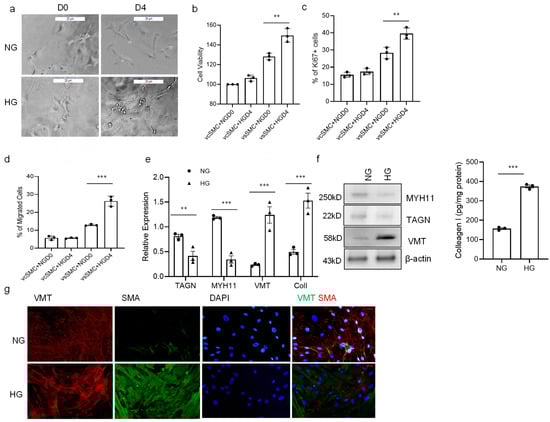 We next sought to determine if high glucose concentration affects the vSMC phenotype. When contractile vSMCs were cultured on Matrigel for a longer period (4 days) in a high-glucose-concentration medium, contractile vSMCs tended to become less spindle-shaped and develop a more irregular morphology associated with synthetic vSMCs (Figure 3a). High-glucose-cultured cells were significantly more proliferative than normal-glucose-cultured cells when evaluated via both the MTT assay and ki67 staining. Contractile vSMCs proliferate 21% more in high-glucose cultures than in normal-glucose cultures (Figure 3b). Immunofluorescent stain showed that high-glucose-treated cells had 11% more ki67-positive cells than untreated cells; ki67+ cells were significantly increased in high-glucose culture while not increased in normal-glucose culture (Figure 3c). Measurements of cell motility were also 49% greater when the cells were cultured in high glucose than in a normal-glucose medium (Figure 3d). Analysis of extracellular matrix (ECM) and vSMC markers with both RT-PCR and Western Blot revealed the cell phenotype shift to synthetic vSMCs. Expression of collagen I and vimentin (VMT) were increased, both markers for synthetic vSMCs, and MYH11 and transgelin (TAGN), both markers for contractile vSMCs, were decreased, while ACTA2, a marker for vSMCs, did not change significantly (Figure 3e,f). In our observation of immunocytometry, there was more vimentin expressed in high-glucose-cultured vSMCs compared to that seen in normal-glucose-cultured vSMCs (Figure 3g). In summary, the high-glucose-treated vSMCs led to a lower expression of MYH11 and TAGN but higher proliferation and migration and produced more ECM proteins, which match with characteristics of the synthetic vSMC phenotype. Thus, a high glucose concentration may induce cultured vSMCs to assume a predominantly synthetic phenotype.